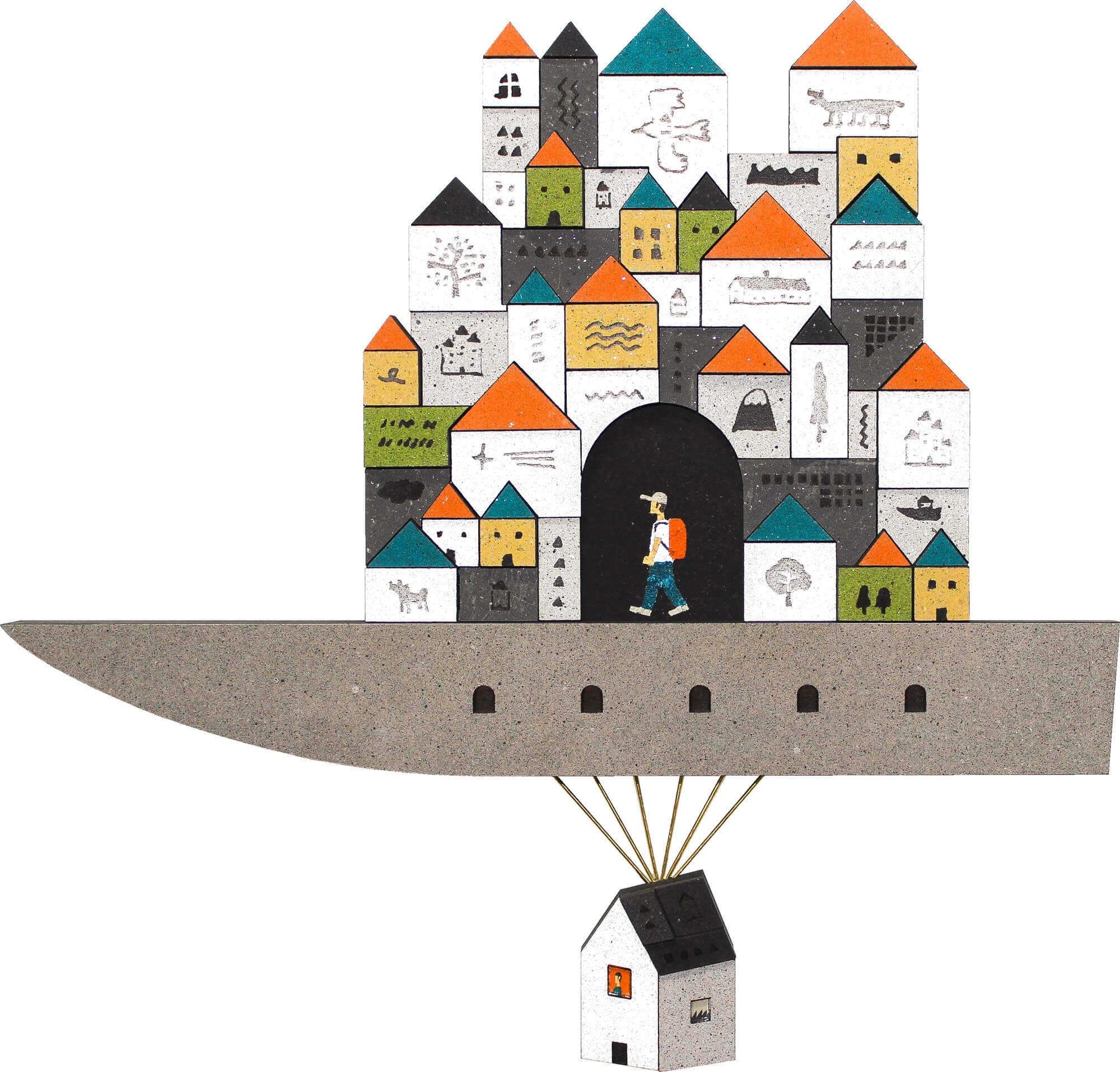 とめどなく溢れるアイデアをもとに、様々な技法を駆使して作品として生み出す稀代のストーリーテラー画家、髙橋 祐次。 細かな木片のパーツを組み上げて作り上げられた幾何学でありながら温かみのある作品は、「絵画」の枠を超えた新しいジャンルのアートと言えるでしょう。